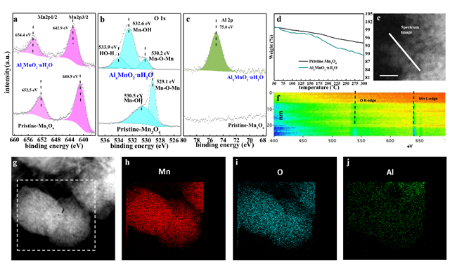 2O的目的。為了驗證該方法的可行性,采用電子能量損失法(EELS),X射線光電子分析以及透射電子顯微鏡-能量色散X射線光譜對反應產物的化學狀態和元素種類進行了分析與表征。通過分析,電化學轉化反應后Mn元素由2價/3價轉化為4價。熱重分析表明反應產物在50~300℃表現出更明顯的質量下降趨勢,表明在轉化反應過程中結晶水的損失(圖1)。通過以上一系列表征分析進一步證明了Mn