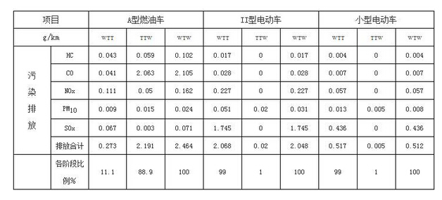 是否所有電動汽車都比燃油車更環(huán)保?汽車的生命周期評估中引入了汽車尾氣中的非甲烷烴(NMHC)、氮氧化物(NOx)、懸浮顆粒物(PM)、硫氧化物(SOx)等排放量的計算。為了便于比較,增加小型電動車的廢氣排放分析,取樣為整備質(zhì)量為400 kg的小型電動汽車,經(jīng)濟(jì)性指標(biāo)目標(biāo)值為5kWh/100 km。根據(jù)電力行業(yè)火電廠平均供電標(biāo)準(zhǔn)煤耗及SOx排放等指標(biāo),基本結(jié)果分析如下:
