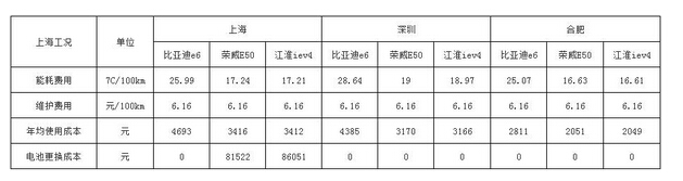 注:上海市充電電價為0.617元/kWh,深圳市充電電價為0.68元/kWh,合肥市充電電價為0.5953元/kWh。上海市消費者日均行駛里程為40km,年均行駛14400km (假設(shè)每年行駛360天);深圳市消費者日均行駛里程為35km,年均行駛12600km;合肥市消費者日均行駛里程為25km,年均行駛9000km。在車輛維護(hù)費用方面,主要包括車輛維護(hù)保養(yǎng)費、車輛維修費、保險費、養(yǎng)路費等,純電動汽車年檢保養(yǎng)費用約為每l00km/6.16元,普通車輛為每l00km/14元;在電池更換成本方面,本文取電池循環(huán)充電次數(shù)為2000次。