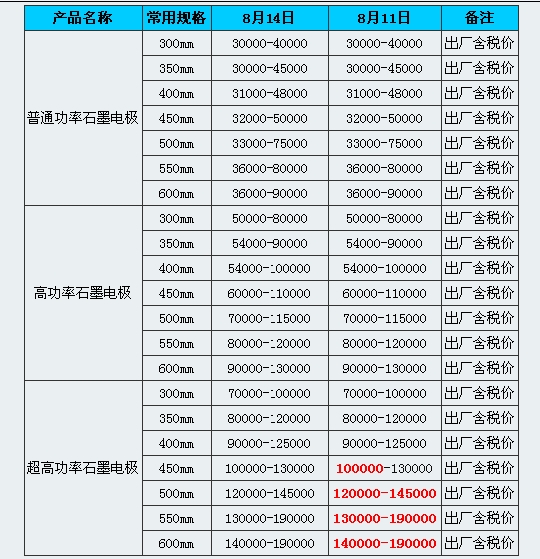 就在8月11日,方大炭素也將普通、高功和超高功率石墨電極價格上調,其中Φ300mm-Φ800mm普通功率石墨電極報價10-萬12萬元/噸;Φ300mm-Φ700mm高功率石墨電極報價12萬-15萬元/噸;Φ550mm-Φ700mm超高功率石墨電極報價16.5萬-19萬元/噸。按照百川資訊的說法,該企業銷售較好,庫存低位。部分產品出口美國、俄羅斯聯邦、德國和阿曼等國家。企業年產能12萬噸,7月份產量9000噸,普通15%,高功30%,超高55%。