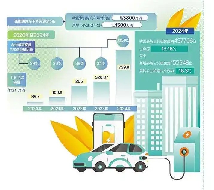 下鄉(xiāng)車型銷量及滲透率持續(xù)攀升。2020年至2024年,下鄉(xiāng)車型銷量分別為39.7萬輛、106.8萬輛、266萬輛、320.87萬輛和759.8萬輛,占當(dāng)年新能源汽車總銷量的比重分別為29%、30%、39%、34%、59.1%。5年間,我國新能源汽車下鄉(xiāng)活動(dòng)車型累計(jì)銷售近1500萬輛。