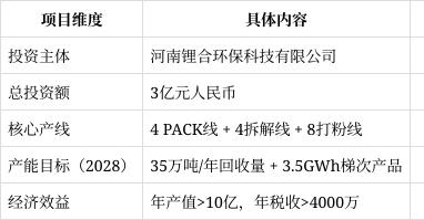 2025年8月13日,湖北天門市政府與河南鋰合環保科技有限公司簽署協議,落地總投資3億元的動力鋰離子電池綜合利用項目。該公司專注電池回收全鏈條服務,目前已在全國布局20個項目、100個區域回收倉,天門項目是其華中核心樞紐 。