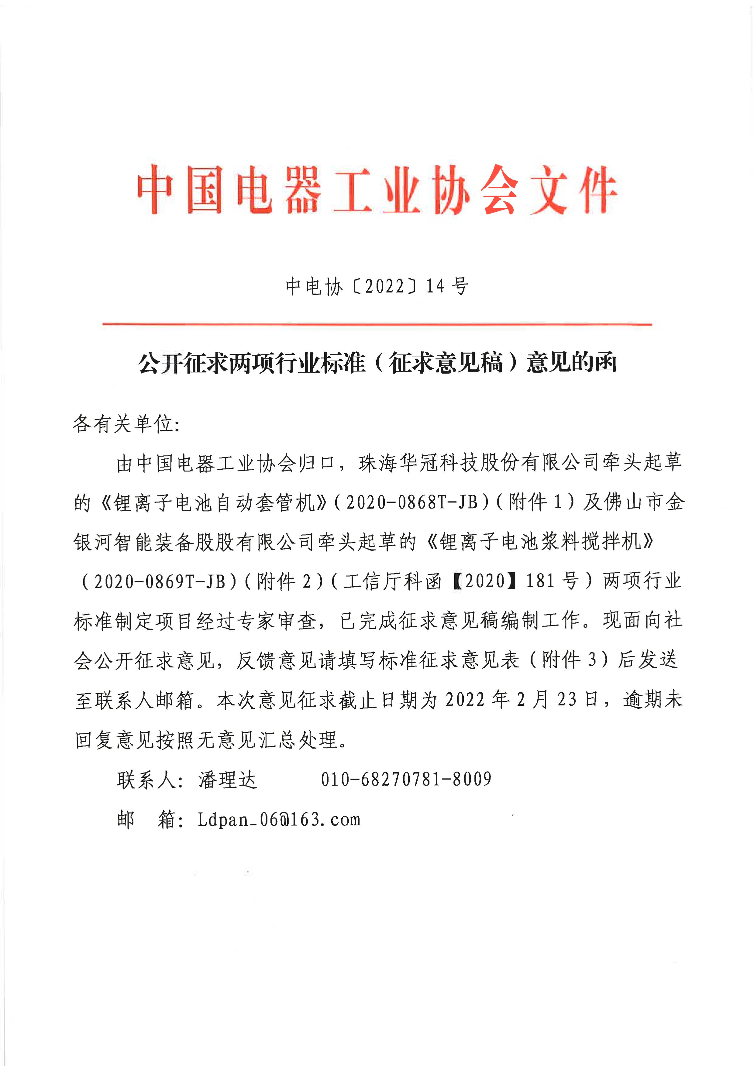 公開征求《鋰離子電池漿料高速分散設備》行業標準意見的函2022-10-12 09:48